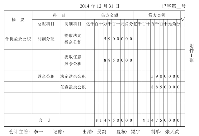 (2)根据审批后的计提表,编制计提盈余公积的记账凭证(见表18-14),并报送财务部负责人稽核。