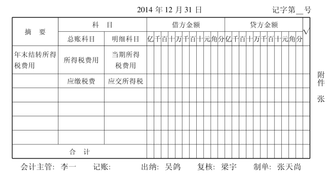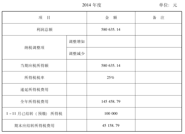 2014年12月31日计算结转本年的所得税费用。所得税率按25%计算,年终汇算清缴全年应交所得税额。(公司1-11月累计利润额529000元,实际已预交所得税100000元。当年无其他纳税调整项目)