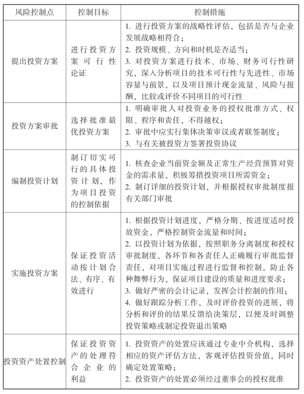 表7-1 投资业务的关键风险控制点、控制目标和控制措施