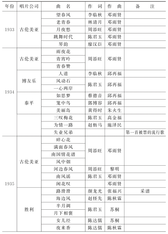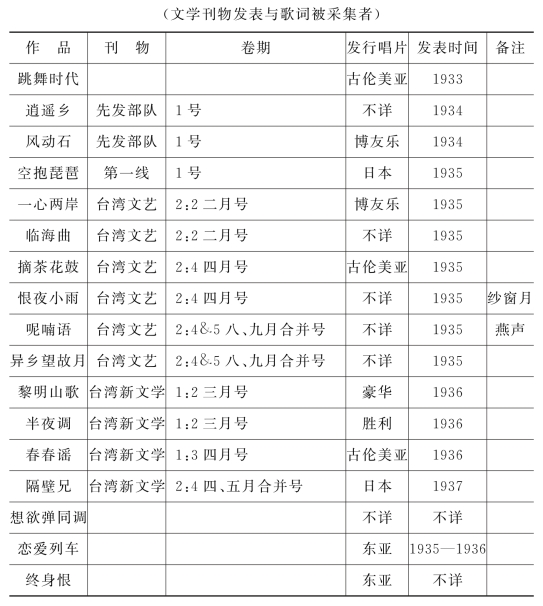 资料来源:庄永明、孙德铭:《台湾歌谣乡土情》;郑恒隆、郭丽娟:《台湾歌谣脸谱》;刘国炜:《台湾思想曲》。