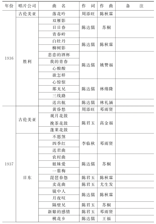 [34]1930年代《先发部队》、《第一线》、《台湾文艺》与《台湾新文学》等;黄国隆、吴艾菁编:《台湾歌谣101》,台北:天同出版社,1985年;庄永明、孙德铭:《台湾歌谣乡土情》,台北:孙德铭(个人),1994年。陈君玉创作歌词内容详见“附录二”。