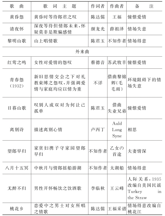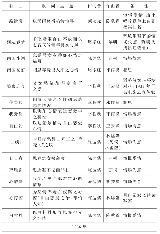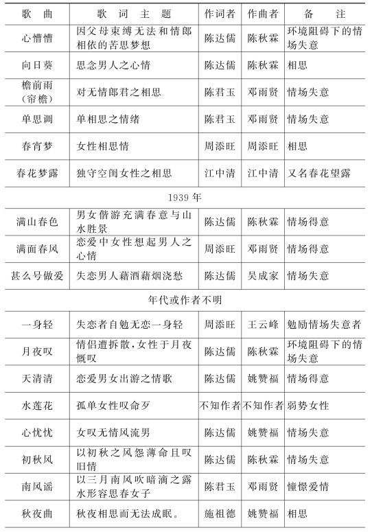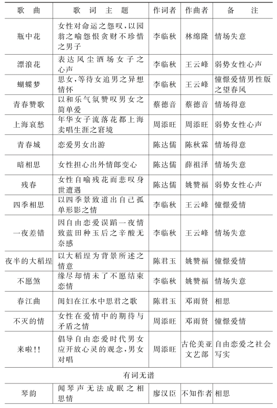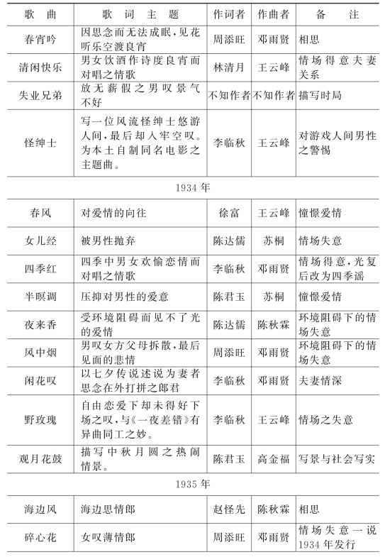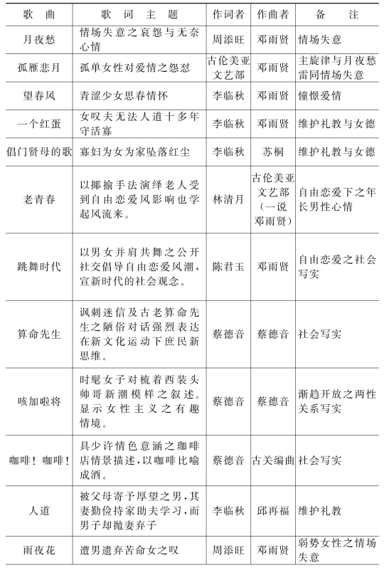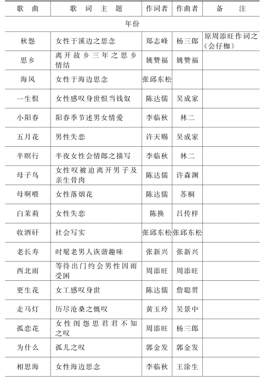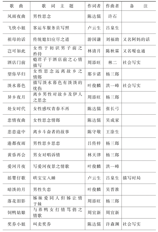 综上回顾台湾闽南语流行歌曲内容及文本,其发靱因着为电影写宣传歌之便,而开启了创作、发行唱片等风潮。这些歌曲的歌词内容主要在叙述电影剧情,自然也频添大陆在1920—1930年代社会关系变化的种种素材。