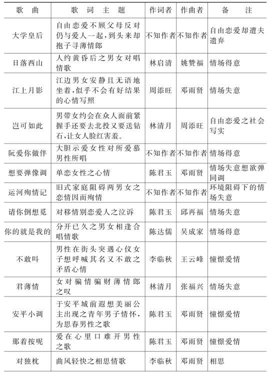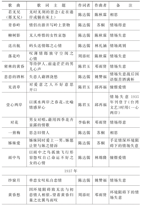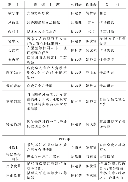 日据时期的词曲作家根据大陆输台电影写下流行歌,亦围绕在其所阐释之维护传统道德的思想主轴,在社会风气正趋向开放的宝岛来说,这类歌曲亦受到欢迎。歌曲一经传唱,不仅传播了电影所欲表达的理念或流行歌之歌词与旋律,其实也宣扬了欲改变传统封建思潮的观点。其情形在接下来所创作的流行歌词中处处可见,流行歌以男女情爱为主要阐释的主题,尤其在男女公开交往方面,已从传统保守风气进入自由开放的阶段;而女性地位的提高,仍待努力,有关贫女卖身的故事也出现在多首歌曲中。总之,过去不敢公开谈论的男女情感抒发与自由恋爱等观点,不断出现在流行歌里。