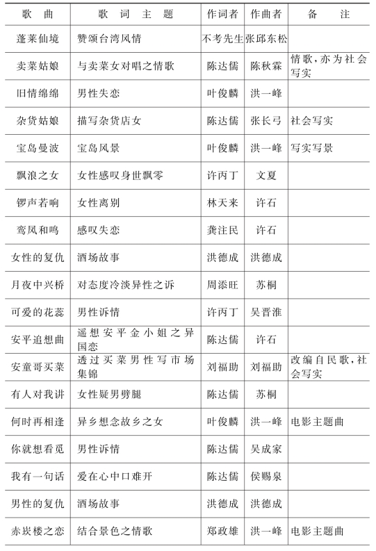 以传统闽南歌仔改编的《安童歌买菜》写出当年平民生活,《老人茶店》写老人家喝茶情景,《台北小曲》介绍台北生活等。此外,也有愈来愈多的歌曲描写美丽宝岛的景色,如:《宝岛四季谣》、《宝岛曼波》、《淡水暮色》、《蓬莱仙境》等。同时,当年代也不乏十里洋场酒色之作,如:徘徊酒店门口之《酒店门前》、酒场故事之《男性的复仇》与《女性的复仇》……随着歌曲的传唱,不仅唱出升斗百姓心声,其歌词文本亦见证了台湾社会的变迁。