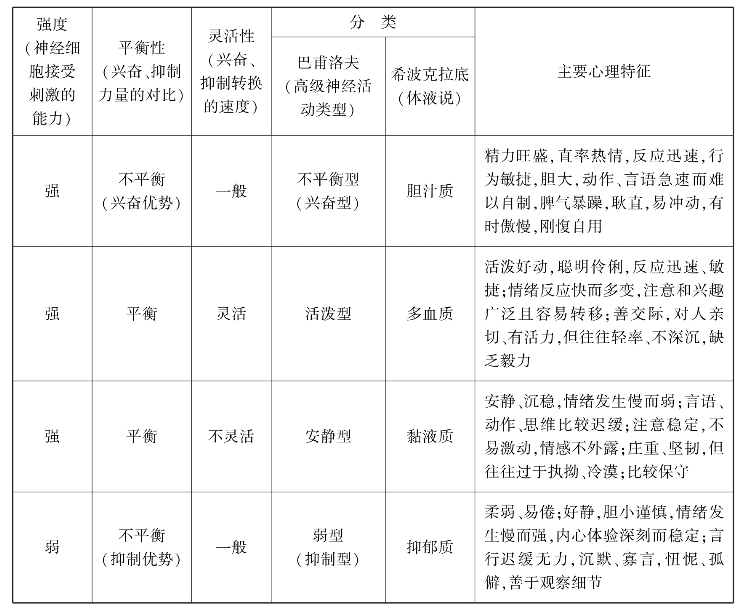 关于气质的分类方法很多,其中影响较大的是西方最早研究气质现象的古希腊医生希波克拉底和罗马医生盖伦,以及20世纪30年代苏联生理学家巴甫洛夫。巴甫洛夫认为他所描述的4种神经系统显著类型恰巧与希波克拉底提出的4种气质类型相符。气质类型分析表如表2-5所示。
