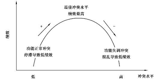 从以上分析可以看出,无论功能正常冲突还是功能失调冲突,都可能造成低绩效,功能正常冲突如果不够,则由停滞导致低绩效,而功能失调冲突过大,则又混乱导致低绩效,因此,冲突的价值需要从绩效的角度来判断。但是从动态的角度看,功能正常冲突增大使绩效逐渐提高,而功能失调冲突增大则使绩效逐渐降低。