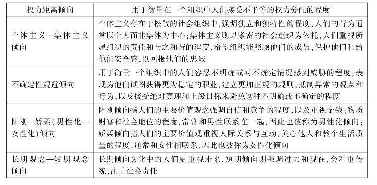 霍夫斯泰德在对40个国家长达7年的问卷调查研究基础上,提出了对组织管理产生影响的民族文化差异的5个方面,即权力距离、不确定性规避、个体主义—集体主义、男性化—女性化、长期观念—短期观念。这通常被称为民族文化的5个维度,5个维度的具体含义如表8-2所示。