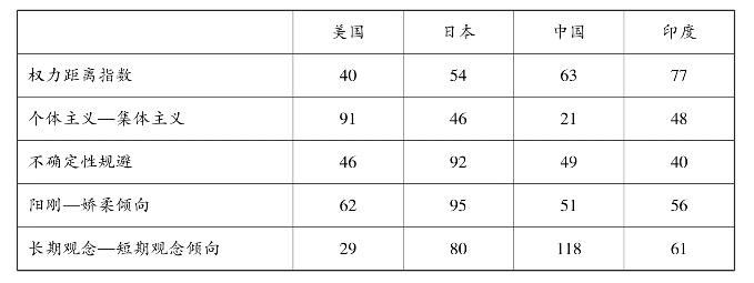 从表8-3可以看出,在权力距离上,印度和中国的得分明显高于日本、美国;中国在个体主义维度上的得分远远低于美国,日本和印度居中;在不确定性规避上,中印美3国无显著差异,而日本则较为突出;在长期导向上,中国的得分最高,日本其次,美国得分最低。