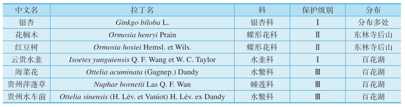 贵州水车前[Ottelia sinensis (H.Lév.et Vaniot) H.Lév.ex Dandy],调查发现在百花湖入湖沟渠中有少量分布,可作为水质表现的指示种。贵州水车前在贵州省《贵州珍稀濒危植物》(1989)中被列为Ⅱ级保护植物,属贵州省的珍稀植物。