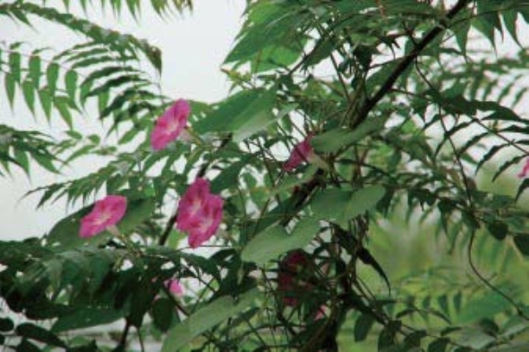 圆叶牵牛[Ipomoea purpurea (L.) Lam.],旋花科一年生缠绕草本,茎上被倒向的短柔毛,杂有倒向或开展的长硬毛。叶圆心形或宽卵状心形,长4~18 cm,宽3.5~16.5 cm,基部圆,心形,顶端锐尖、骤尖或渐尖,通常全缘,偶有3 裂,两面疏或密被刚伏毛;叶柄长2~12 cm,毛被与茎同。花腋生,单一或2~5 朵着生于花序梗顶端成伞形聚伞花序,花序梗比叶柄短或近等长,长4~12 cm,毛被与茎相同;苞片线形,长6~7 mm,被开展的长硬毛;花梗长1.2~1.5 cm,被倒向短柔毛及长硬毛;萼片近等长,长1.1~1.6 cm,外面3 片长椭圆形,渐尖,内面2 片线状披针形,外面均被开展的硬毛,基部更密;花冠漏斗状,长4~6 cm,紫红色、红色或白色,花冠管通常白色,瓣中带于内面色深,外面色淡;雄蕊与花柱内藏;雄蕊不等长,花丝基部被柔毛;子房无毛,3 室,每室2 胚珠,柱头头状;花盘环状。蒴果近球形,直径9~10 mm,3 瓣裂。种子卵状三棱形,长约5 mm,黑褐色或米黄色,被极短的糠粃状毛。本种原产于热带美洲,广泛引植于世界各地后,已成为归化植物。