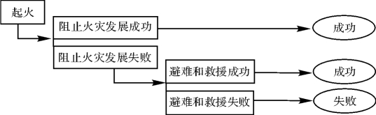 住宅火灾通常有一个从小到大、逐步发展,直至熄灭的过程,从可燃物被点燃开始,一般可分为初起、发展、猛烈、衰弱和熄灭五个阶段,根据可燃物的性质和火灾现场环境的不同,火灾各阶段的时间也是不一样的。[7]根据火灾发生的过程及特点可以绘制出火灾事件树图(见图3-2):