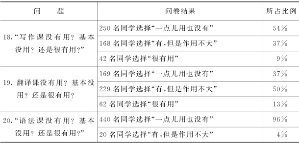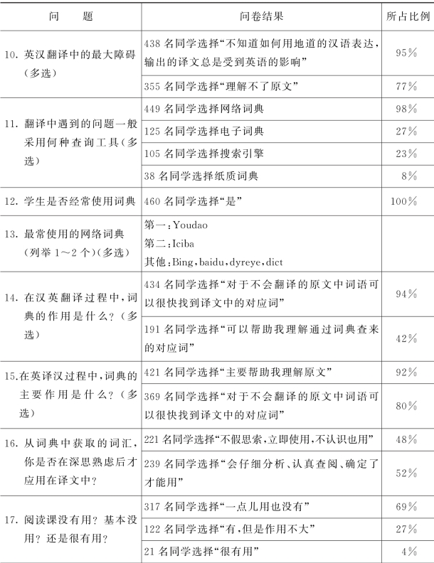 笔者在2012年6月份针对福建省四所高校英语专业三年级的学生展开了一项问卷调查,以期探究他们课外的阅读、写作、翻译及词典使用习惯。此项问卷共调研了12个自然班,收回问卷480份,有效问卷460份(部分问卷由于不完整等被判定为无效问卷)。其中,124份来自厦门理工学院,112份来自闽南师范大学,104份来自莆田学院,120份来自集美大学。所有的受访者都有类似的语言背景,大部分都通过了英语专业四级考试,以下结果能够基本、如实地反映学生的课外阅读习惯。(下表仅列举了学生写作、翻译、词典使用习惯的问卷结果,相关分析会在后面的章节中呈现。)