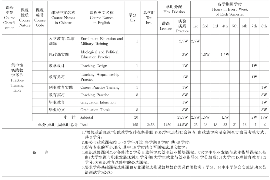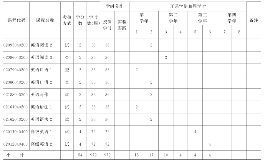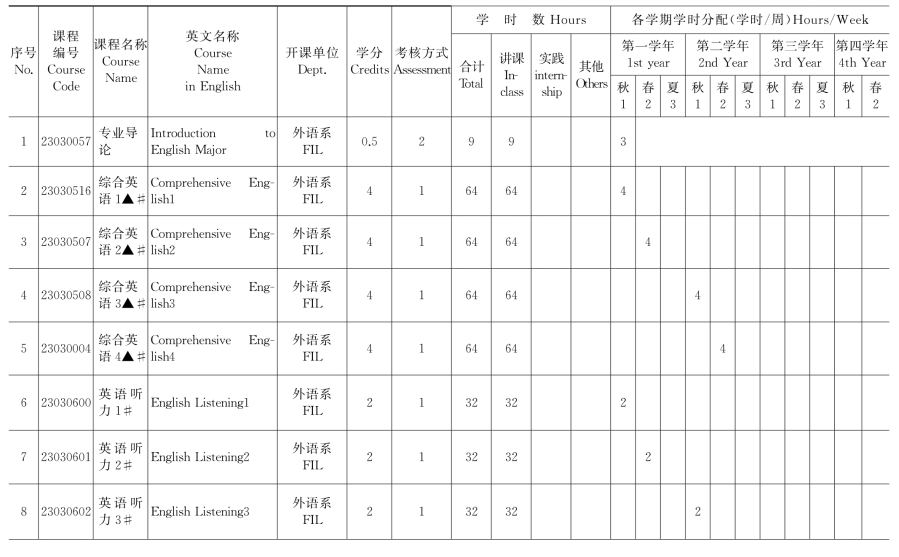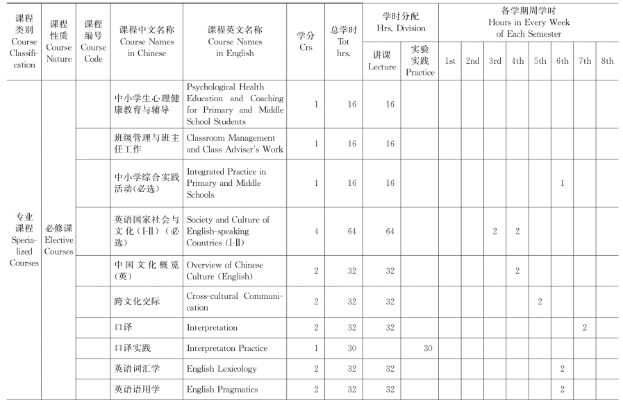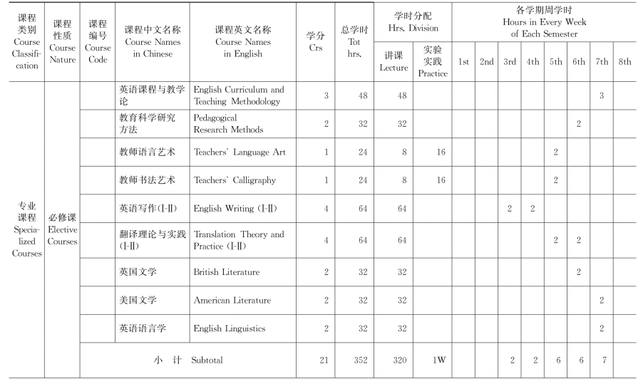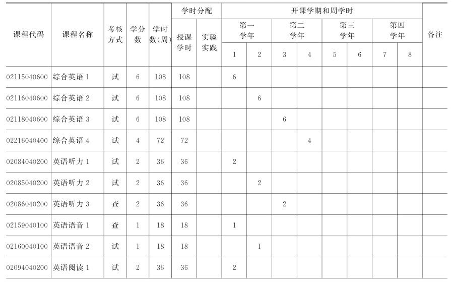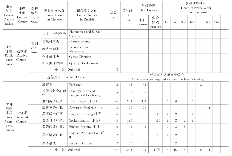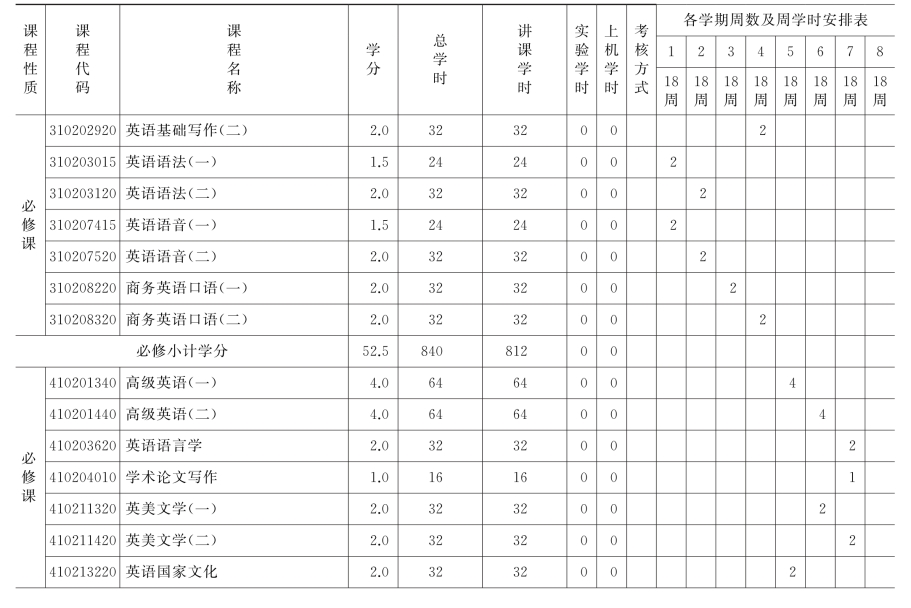 集美大学英语(师范类方向)专业教学计划表