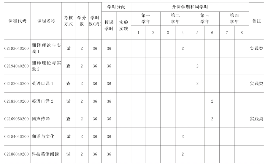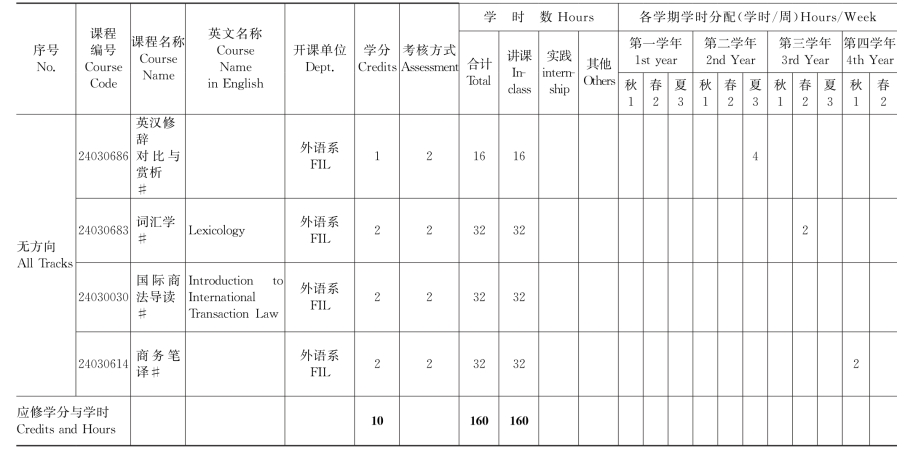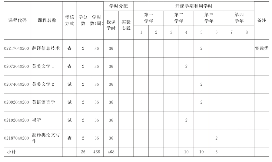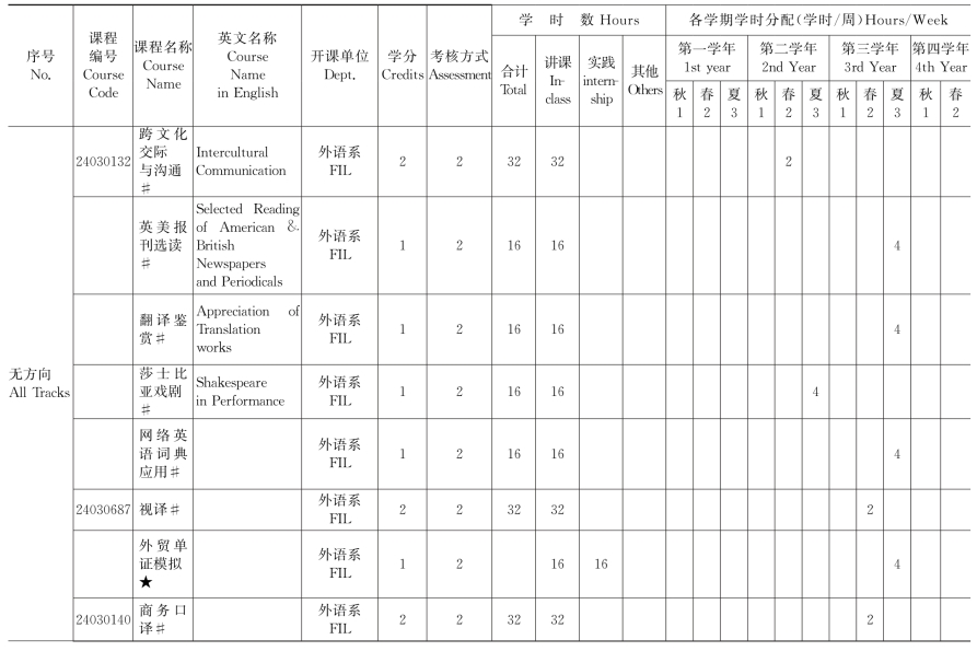 英语(翻译方向,非师)专业课程设置学时学分比例表
