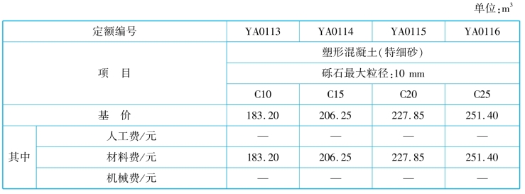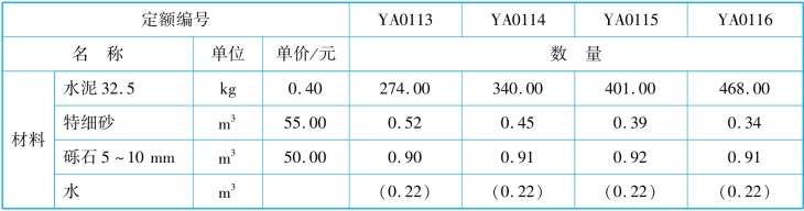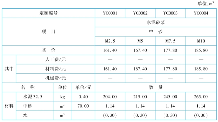混凝土及砂浆配合比根据《普通混凝土配合比设计规程》(JGJ 55)、《砌筑砂浆配合比设计规程》(JGJ/T 98)等规范、标准编制。其内容包括人工费、材料费、机械费以及材料的组成明细,其格式见表2.5和表2.6。