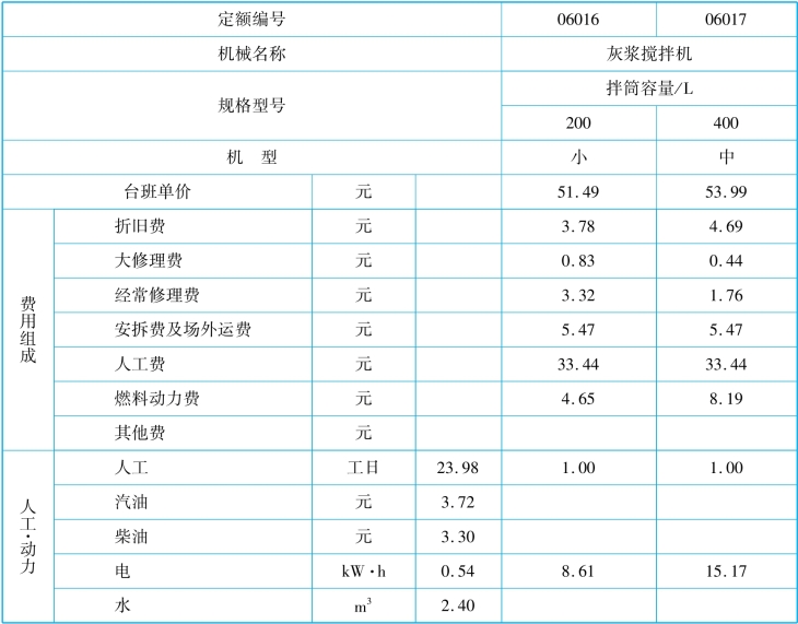 施工机械台班定额根据建标〔2001〕196号文颁发的《全国统一施工机械台班费用编制规则》,并结合实际情况进行编制。其内容包括折旧费、大修理费、经常修理费、安拆费及场外运费、人工费、燃料动力费、其他费(包括养路费、车船使用税及保险费),其格式见表2.4。