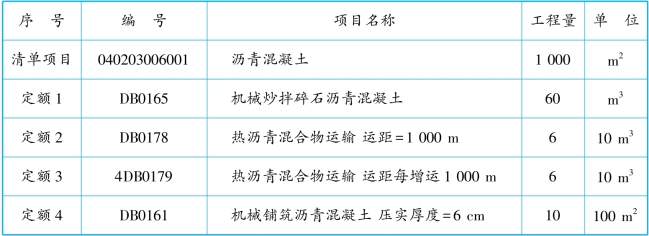 【例5.2】 某道路铺设中粒式沥青混凝土(碎石)路面,铺设面积为1 000 m2,中粒式沥青混凝土路面厚度为6 cm。该沥青混凝土路面铺设的整个施工过程为:机械炒拌细粒式沥青混凝土→运输沥青混合料(运距=5 km)→机械铺筑6 cm厚热沥青混合料。试确定清单项目、清单项目所套定额、清单工程量和定额工程量[本例的定额采用《四川省建设工程工程量清单计价定额——市政工程》(2020版)]。