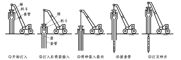 ③规则解读。袋装砂井是用透水型土工织物长袋装砂砾石,设置在软土地基中形成排水砂柱,以加速软土排水固结的地基处理方法。袋装砂井的施工过程如图5.23所示。