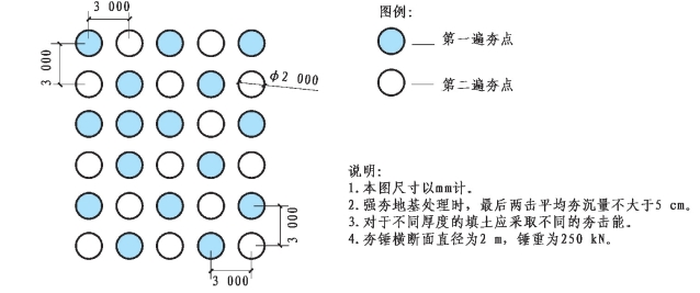 ①计算规则。强夯分满夯、点夯,区分不同夯击能量,按设计图示尺寸的夯击范围以面积计算。设计无规定时,按每边超过基础外缘的宽度3 m计算。