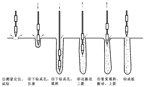 ②工作内容。砂石桩的工作内容包括成孔、填充、振实,材料运输。
