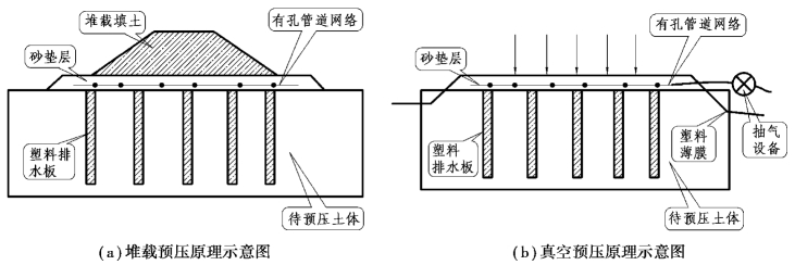 a.堆载预压。堆载预压是在原状土体上加载,使土体中的孔隙水沿竖向排水板排出,逐渐固结,地基发生沉降,同时强度逐步提高。堆载预压的原理示意图如图5.19(a)所示。
