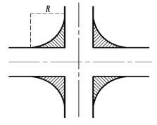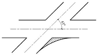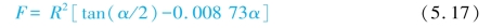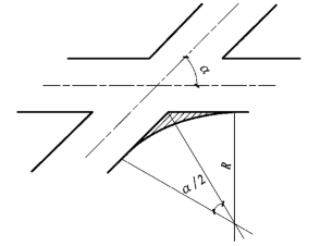 【例5.17】 某市政道路工程斜交路口如图5.35所示,若图中阴影部分所示转角部位圆曲线的半径R=20 m,试计算阴影部分的转角面积。