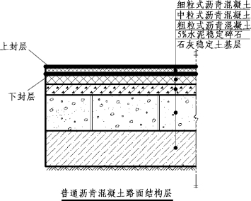 ③规则解读。封层指的是为封闭表面空隙,防止水分浸入面层或基层而铺筑的沥青混合料薄层。铺筑在面层表面的称为上封层;铺筑在面层下面的称为下封层。封层的工程量以“m2”计量。封层在沥青路面结构图中的具体位置如图5.31所示。