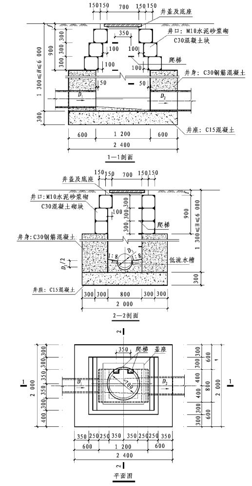 ③规则解读。在对市政道路结构层的改造过程中,由于原有的路面高程会提升或降低,导致原有检查井的标高相应的提升或降低的施工过程,可以采用“检查井升降”项目。检查井的升降是利用预制的混凝土砌块或混凝土管节作为井口,增加或者减少混凝土砌块或混凝土管节的个数来达到升降检查井标高的目的。具体的装配式混凝土检查井的详图,详见图5.39。