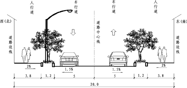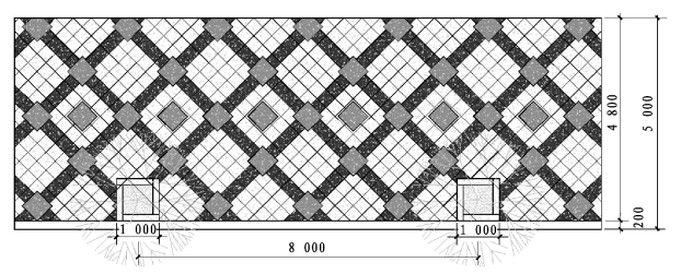 【例5.19】 某市政道路标准横断面如图5.37所示,图中尺寸以m计。若该段市政道路长度为500 m,其余参数详见图5.38人行道铺装平面图,图中尺寸均以mm计。试根据《计算规范》计算该段市政道路的人行道块料铺设的清单工程量。