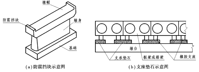 ③规则解读。混凝土其他构件是指除上述梁桥、拱桥、斜拉桥、悬索桥的墩台基础、下部结构和桥跨结构以外,其他的一些由混凝土构成的小型混凝土构件,如桥墩墩帽挡块、盖梁挡块、支座垫石等构件。防震挡块和支座垫石的示意图如图5.71所示。混凝土其他构件的工程量按设计图示尺寸以“m3”计量。