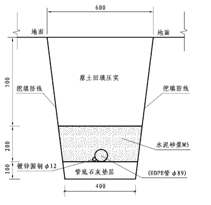 某市政路灯工程,采用成套LED路灯智能控制系统柜集中供电,10 m高成套单臂单杆路灯(150 W),路灯电缆埋地敷设横断面如图5.118所示(图中尺寸均以cm计),路灯电缆采用VV-1 kV-3×10 HDPE89 FC,接地母线采用ϕ12镀锌圆钢。整个工程主要设备及材料详见表5.14。