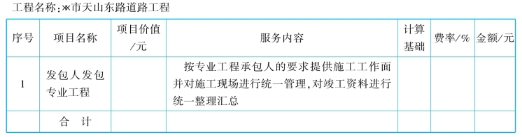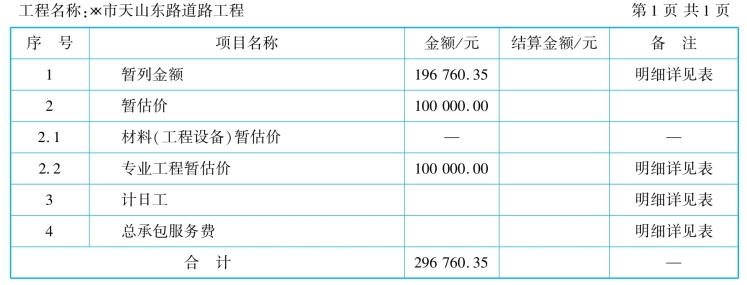 ④编制其他项目清单与计价汇总表,见表5.18。其他项目清单所涵盖分表:暂列金额明细表,见表5.19;专业工程暂估价表,见表5.20;计日工表,见表5.21;总承包服务费计价表,见表5.22。各分表费用的具体计算细则见表下说明。