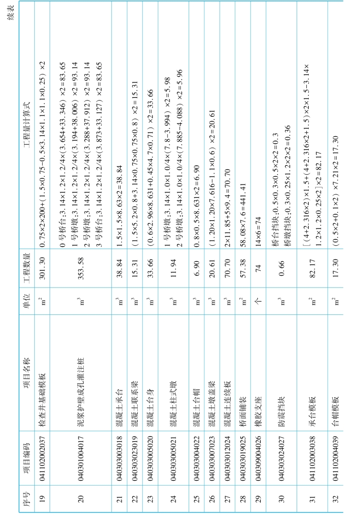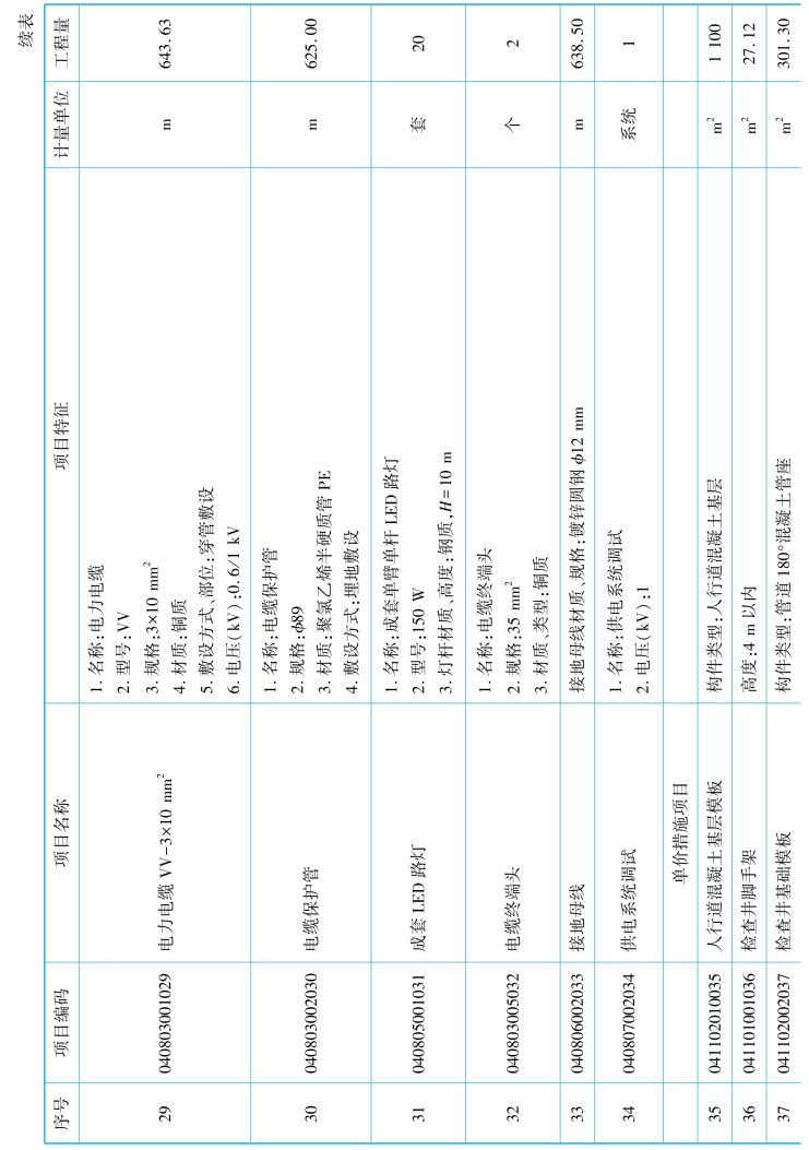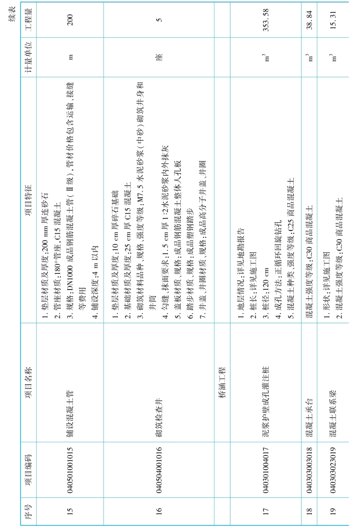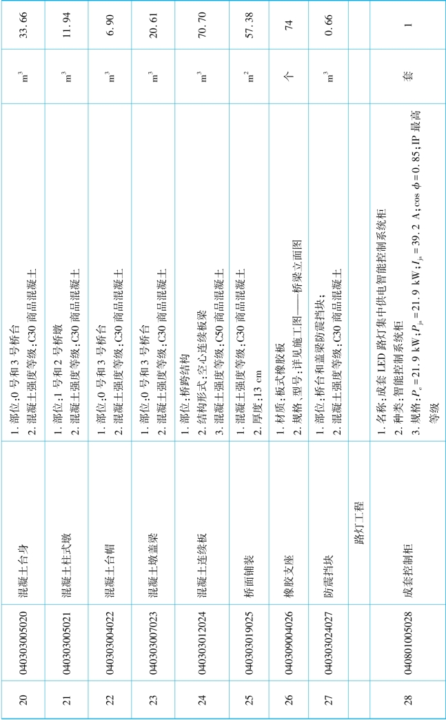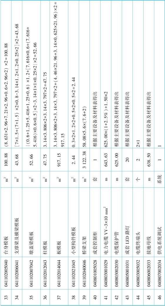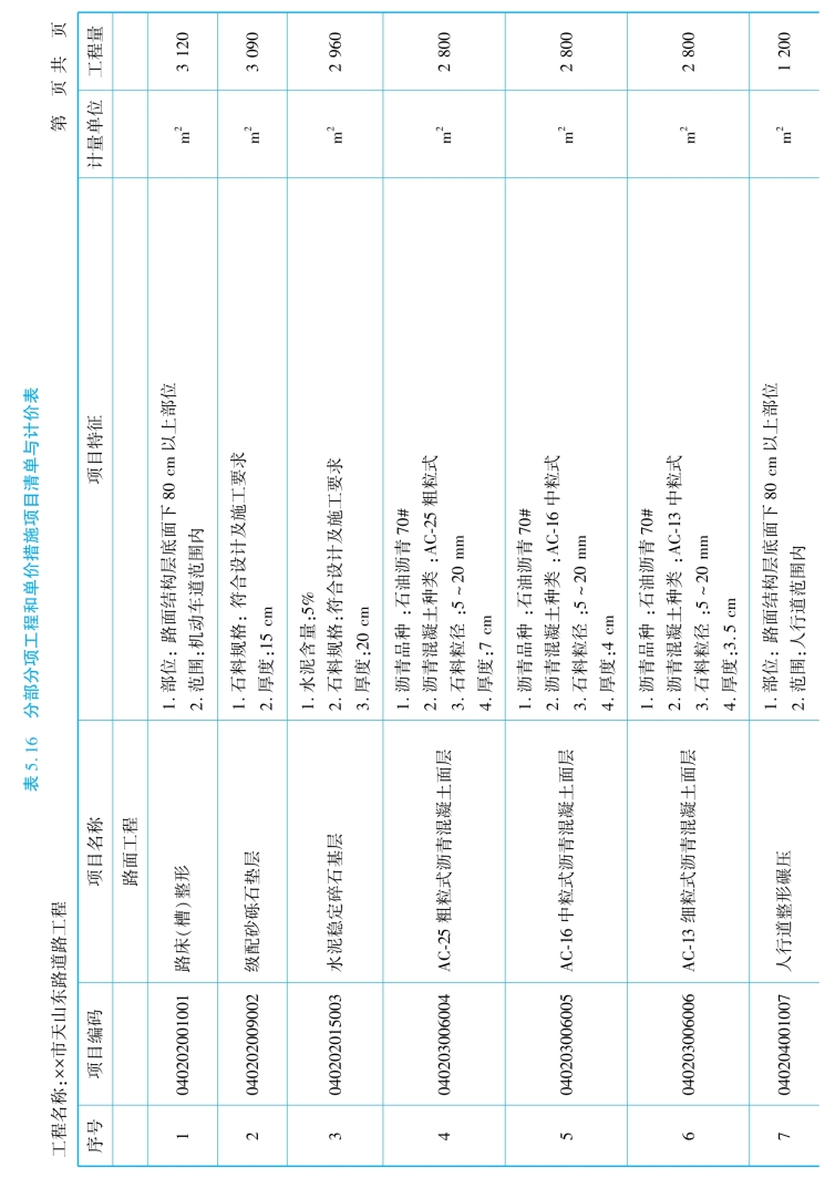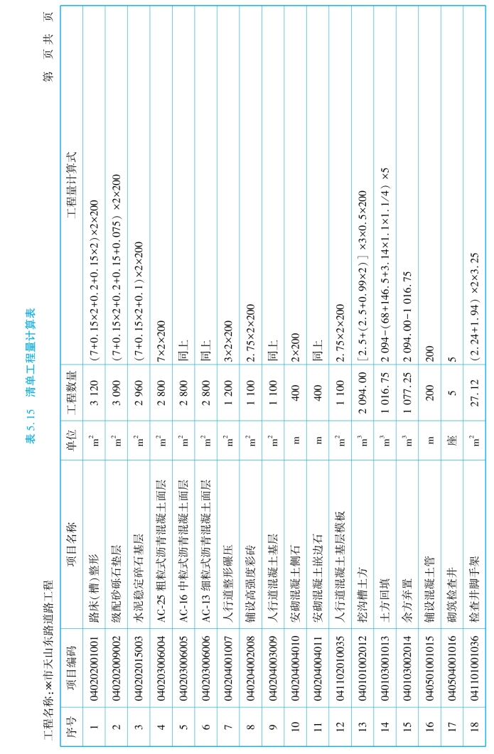 根据《建设工程工程量清单计价规范》(GB 50500—2013)和《市政工程工程量计算规范》(GB 50857—2013),计算“××市天山东路道路工程”的路面工程、管道工程、桥梁工程和路灯工程的工程量,计算结果见表5.15。