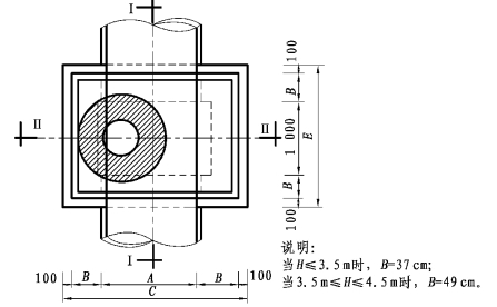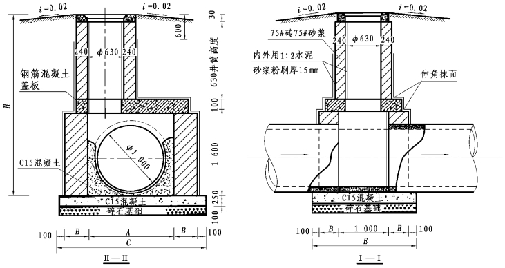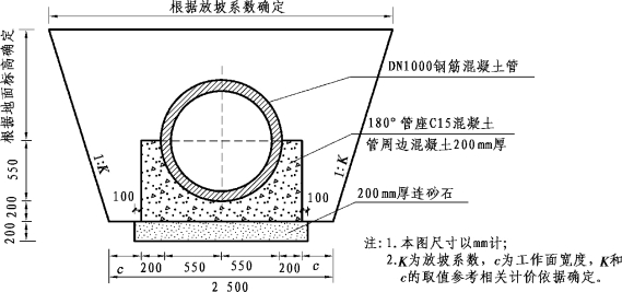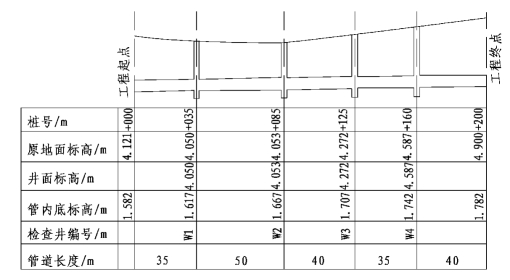 污水管道工程的起点为道路起点K0+000,终点为道路终点K0+200,污水管采用公称直径为DN1000的钢筋混凝土Ⅱ级承插管。管线纵断面图详见图5.107;管道埋设断面图详见图5.108;各污水检查井的平面图详见图5.109;剖面图1和剖面图2详见图5.110。