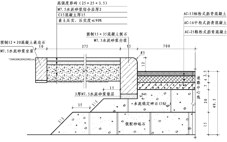 道路等级:城市次干路Ⅰ级;设计使用年限:10年;设计车速:50 km/h;路面结构类型:沥青路面结构。该道路总长度为200 m,该段道路为直线段,无交叉口。道路标准横断面属典型的三块板结构,机动车道总宽度为14 m,无中央分隔带,人行道上无树池。路面结构层详见图5.106(图中未标注的尺寸单位以cm计)。本工程不包含道路路基工程。
