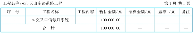 说明:专业工程暂估价应根据拟建工程特点确定。本工程根据招标文件,道路交叉口交通信号灯系统工程由招标人另行招标,估算道路交叉口交通信号灯系统工程工程量,参照市场价格,估算该项专业工程价款(包括规费和税金以外的所有费用)为100 000.00元。