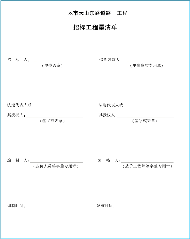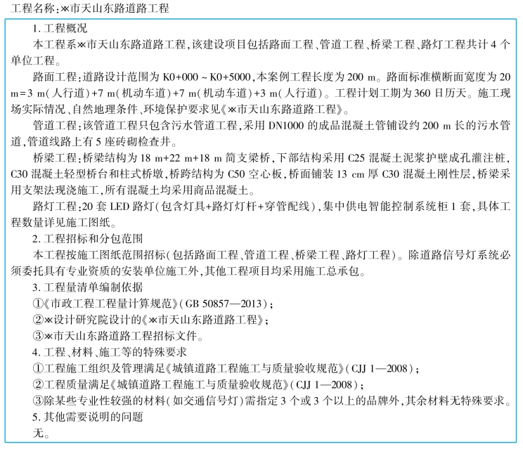 为便于理解和掌握工程量清单编制的基本知识和基本方法,下面以“××市天山东路道路工程”为例,介绍招标工程量清单的编制。