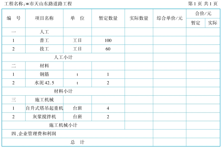 说明:计日工应根据拟建工程特点确定。本工程根据招标文件,编制招标工程量清单时,根据工程实际情况暂定一定数量的计日工,在编制招标控制价和投标报价时可参考报价。
