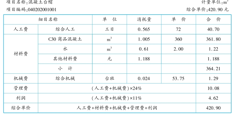 综合单价=40.70+364.21+1.29+10.08+4.62=420.90(元/m3)