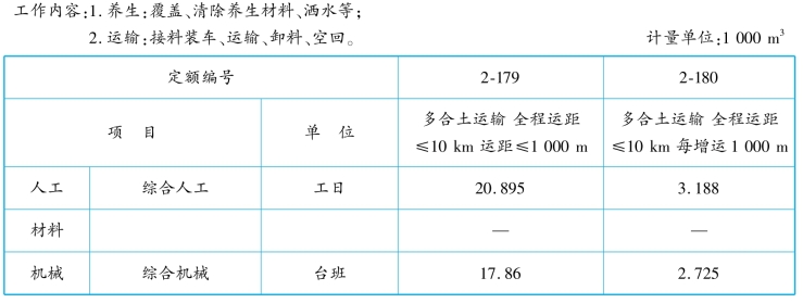 ①多合土运输。定额编号2-179(见表6.11),由于《计算规范》和《计价定额》的工程量计算规则不同,所以需要重新计算工程量,用工料消耗系数将工料摊销入水泥稳定碎石基层内,计算过程参见“清单项目综合单价组成表”(见表6.12)。