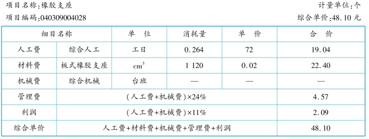 【例6.4】 计算“××市天山东路道路工程”中桥梁工程的“橡胶支座”项目的综合单价。