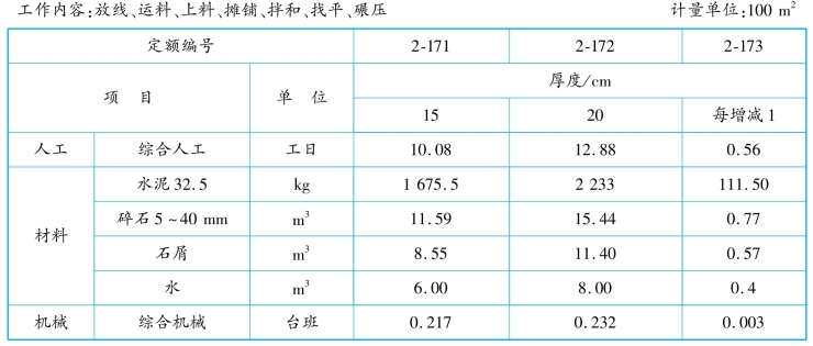 ②水泥稳定碎石基层铺筑。定额编号2-172(定额见表6.9),由于《计算规范》和《计价定额》的工程量计算规则相同,所以直接套用定额,计算过程参见“清单项目综合单价组成表”(见表6.12)。