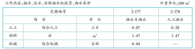 ③顶层多合土养生。定额编号2-177(定额见表6.10),由于《计算规范》和《计价定额》的工程量计算规则相同,所以直接套用定额,计算过程参见“清单项目综合单价组成表”(见表6.12)。