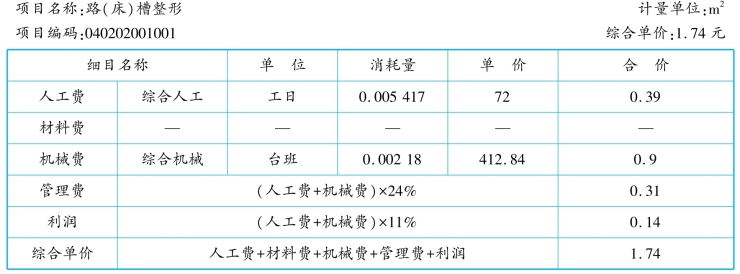 【例6.1】 计算“××市天山东路道路工程”中路面工程的“路(床)槽整形”项目的综合单价。