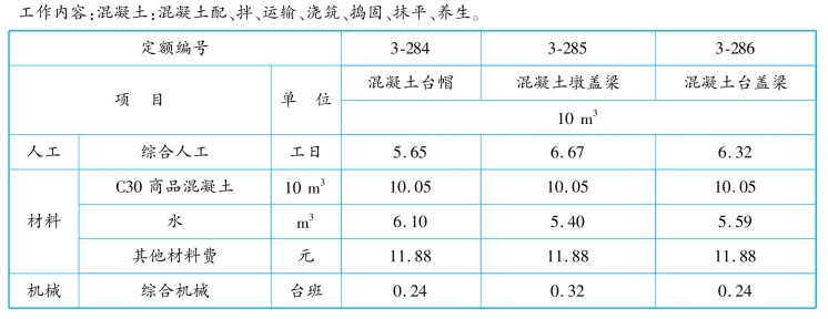 【例6.2】 计算“××市天山东路道路工程”中桥梁工程的“混凝土台帽”项目的综合单价。