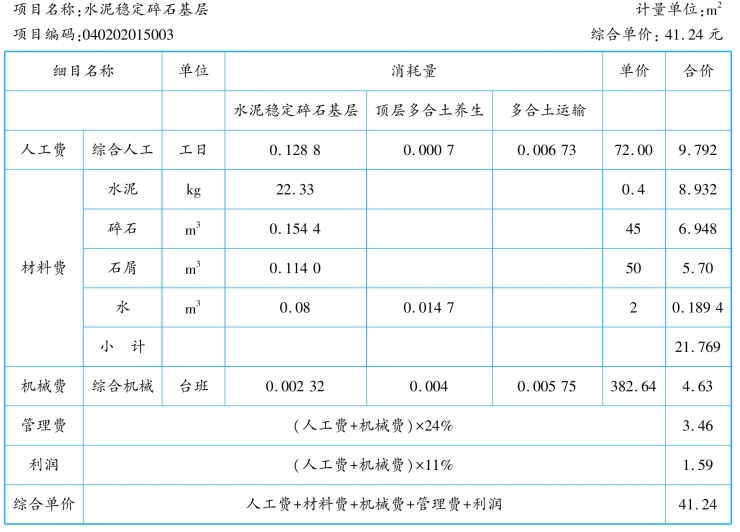 【例6.5】 计算“××市天山东路道路工程”中路面工程的“水泥稳定碎石基层”项目的综合单价。