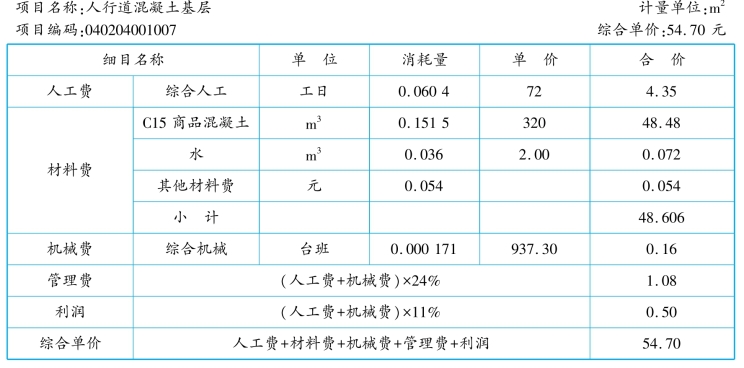 【例6.3】 计算“××市天山东路道路工程”中路面工程的“人行道混凝土基层”项目的综合单价。