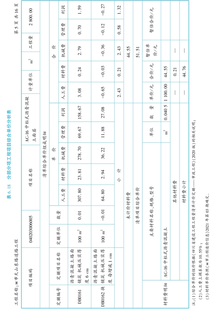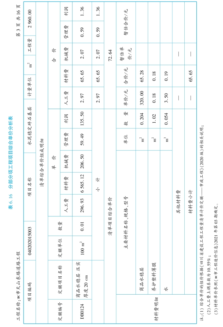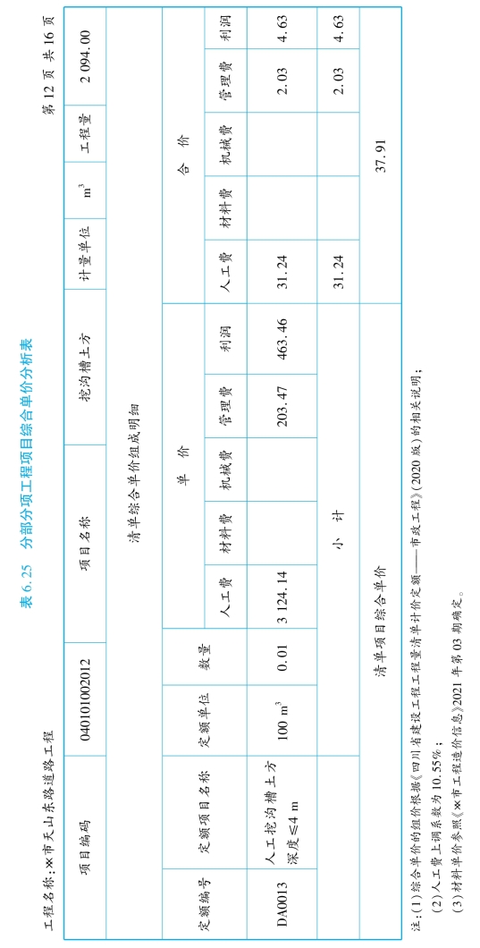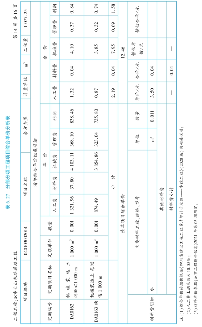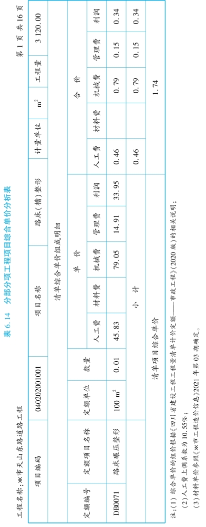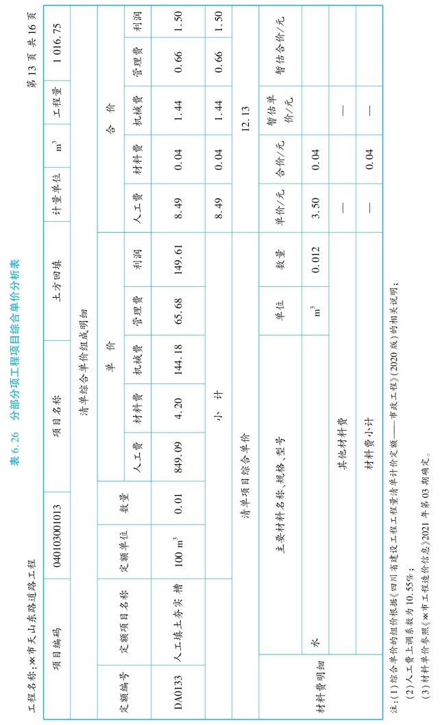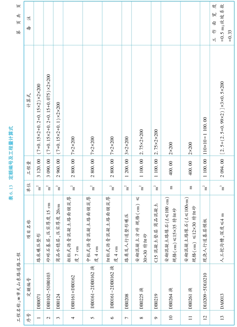 【例6.7】 根据《建筑安装工程费用项目组成》(建标〔2013〕44号)、《建设工程工程量清单计价规范》(GB 50500—2013)、《市政工程工程量计算规范》(GB 50857—2013),编制“××市天山东路道路工程”的“分部分项工程项目清单与计价表”。