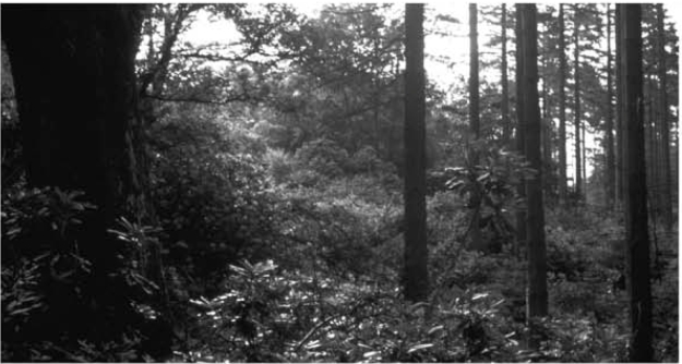 在海拔1100米~1500米之间的山上,布满了针叶林,红松、鱼鳞云杉、红皮云杉和臭冷杉,长白落叶松是这些树种常见的伴生树。从海拔1500米~1800米,由于气温降低,空气湿度大,由鱼鳞云杉、臭冷杉和红皮云杉等抗寒的针叶树组成的寒温性针叶林,代替了茂密的阔叶树和针叶树的混交林。这些抗寒树种的枝叶,紧密交织,形成网络,构成茂密的森林华盖和阴暗潮湿的林地。因此,云杉和冷杉林就被称为暗针叶林。只有一些喜阴的小灌木,能够在这些阴暗的林地上成活。