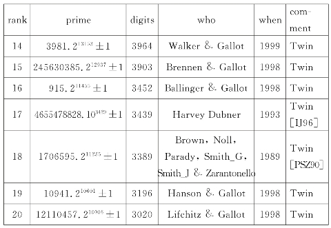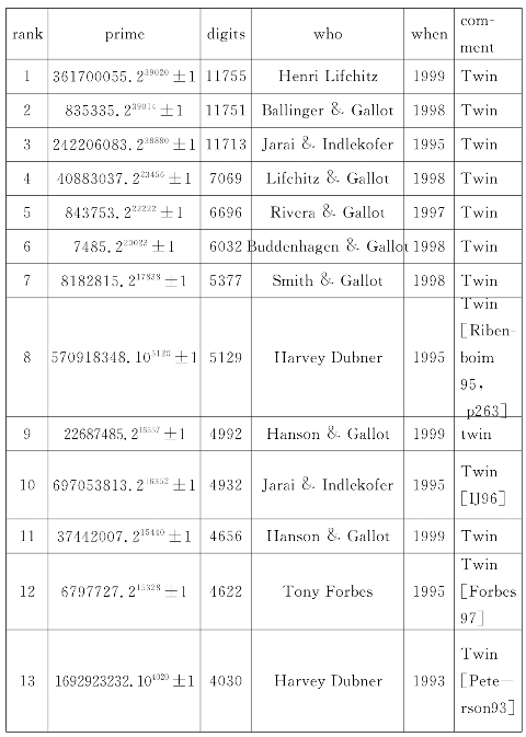 另一种非常重要的是神秘的素数对,或成为孪生素数,孪生素数是指如果p是素数且p+2也是素数,则称p和p+2为一对孪生素数,比如5,7;11,13等等.下表是目前所发现的最大的前二十个孪生素数: